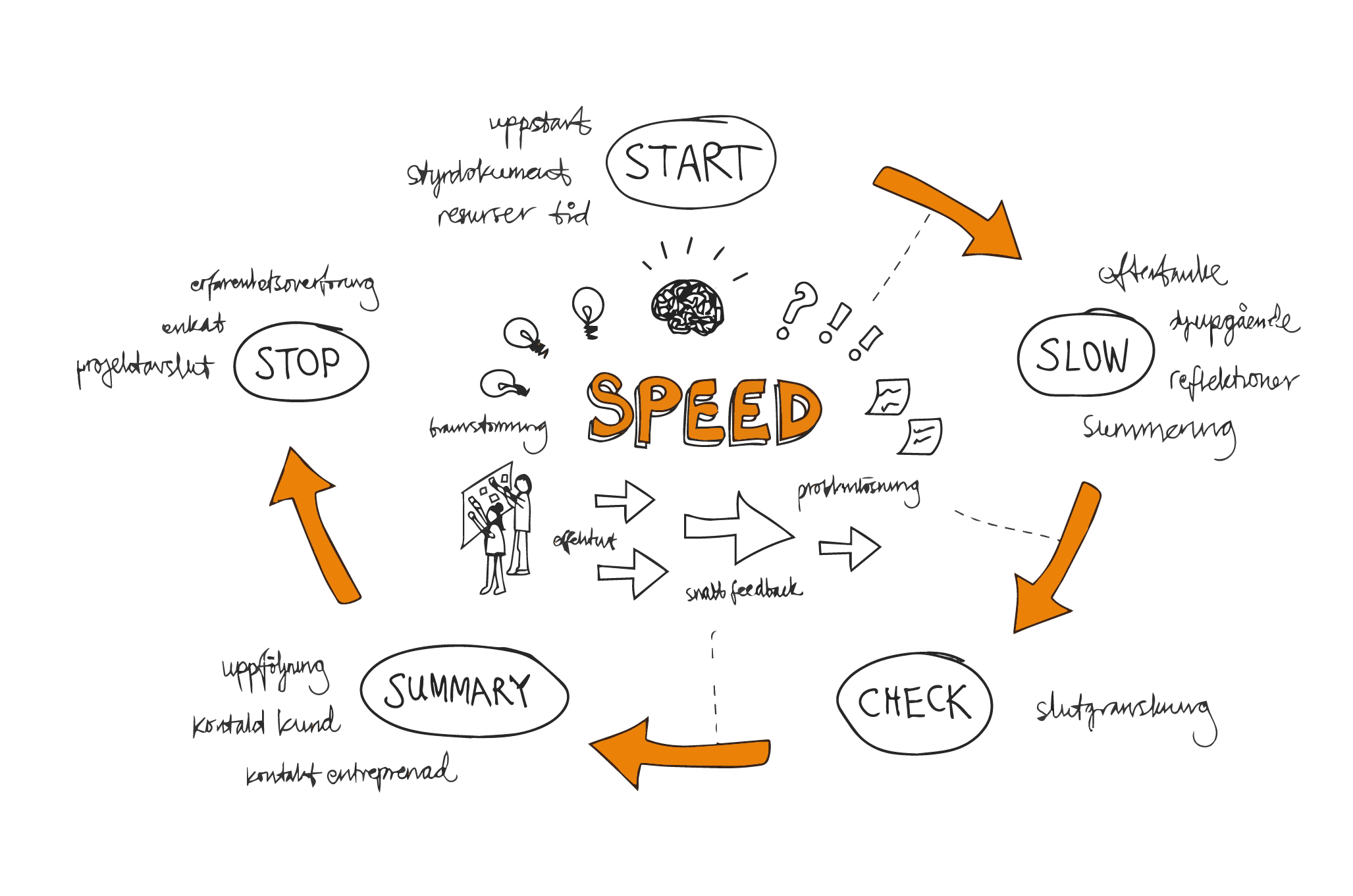 Varje uppdrag är unikt, men för att säkerställa kvalitet har vi utvecklat vår egen arbetsprocess. I den varvas snabba brainstorming-sessioner med mer djupgående detaljarbete. Hela tiden med beställare och slutanvändare i fokus.